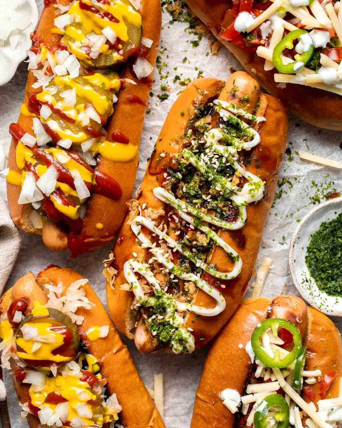 the famous hot dog. includes chicago, new york, and seattle dogs.