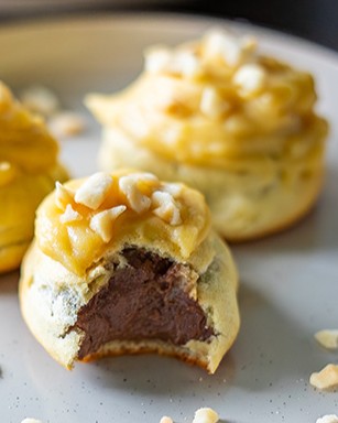 3. add the chantilly frosting, using another piping bag with a medium tip. swirl it on the top of the coco puff.