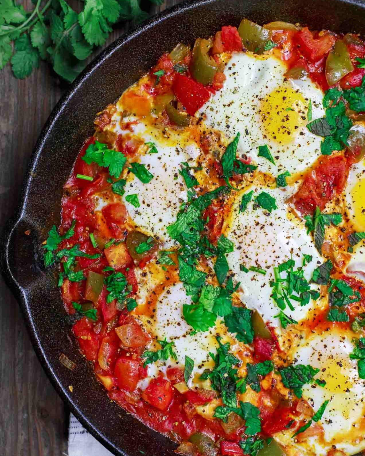 poached eggs in a yummy, spiced sauce of tomatoes, bell peppers, and onions.