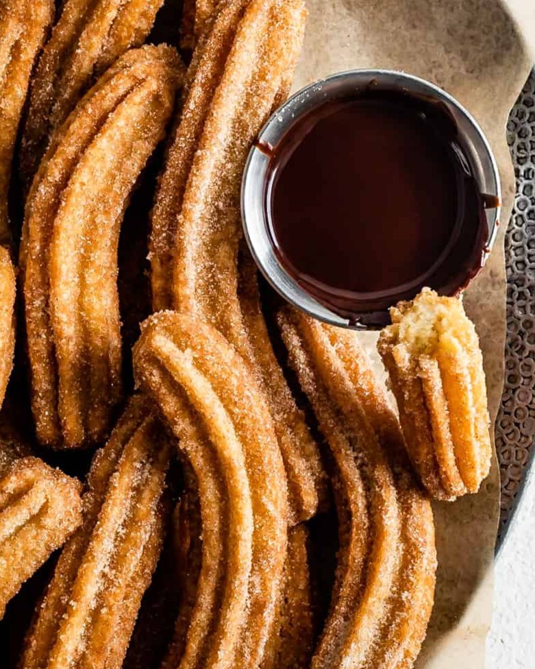 7. remove churros from the pan, placing them on a plate lined with paper towels. serve with dipping sauce.