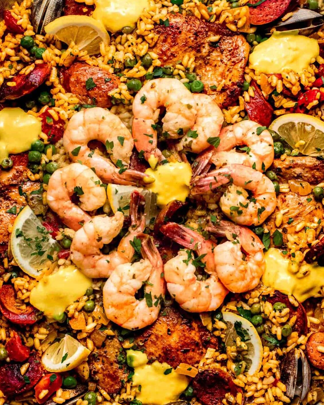 5. cook uncovered for 15-18 mins. nestle the shrimp, mussels, and calamari into the mixture. sprinkle peas on top. continue to cook for 5 more mins. watch for the liquid to be absorbed, the rice at the top almost tender.